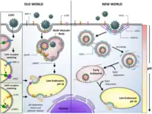 Unlike most enveloped viruses which use clathrin coated pits for cellular entry and bind to their receptors in a pH dependent fashion, Lassa and lymphocytic choriomeningitis virus instead use an endocytotic pathway independent of clathrin, caveolin, dynamin and actin. Once within the cell the viruses are rapidly delivered to endosomes via vesicular trafficking albeit one that is largely independent of the small GTPases Rab5 and Rab7. On contact with the endosome pH-dependent membrane fusion occurs mediated by the envelope glycoprotein, which at the lower pH of the endosome binds the lysosome protein LAMP1 which results in membrane fusion and escape from the endosome.