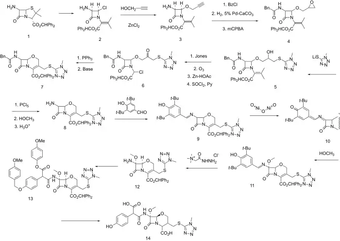 The benzhydrol ester of 6-Aminopenicillanic acid (6-APA) is S-chlorinated and treated with base whereupon the intermediate sulfenyl chloride fragments (to 2). Next, displacement with propargyl alcohol in the presence of zinc chloride gives predominanntly the stereochemistry represented by diastereoisomer 3. The side chain is protected as the phenylacetylamide; the triple bond is partially reduced with a 5% Pd-CaCO3 (Lindlar catalyst) and then epoxidized with mCPBA to give 4. The epoxide is opened at the least hindered end with 1-methyl-1H-tetrazole-5-thiol to put in place the future C-3 side chain and give intermediate 5. Jones oxidation followed in turn by ozonolysis (reductive work-up with zinc-AcOH) and reaction with SOCl2 and pyridine give halide 6. The stage is now wet for intramolecular Wittig reaction. Displacement with PPh3 and Wittig olefination gives 1-oxacephem 7. Next a sequence is undertaken of side chain exchange and introduction of a 7-methoxyl group analogous to that which is present in cephamycins and gives them the enhanced beta-lactamase stability. First 7 is converted to the imino chloride with PCl5 and then to the imino methyl ether (with methanol) and next hydrolyzed to the free amine (8). Imine formation with 3,5-di-t-butyl-4-hydroxybenzaldehyde is next carried out leading to 9. Oxidation with nickel(III) oxide gives iminoquinone methide 10, to which methanol is added in a conjugate sense and in the sterechemistry represented by formula 11. The imine is exchanged with Girard's reagent T to give 12, and this is acylated by a suitable protected arylmalonate, as the hemiester hemiacid chloride so as to give 11. Deblocking with aluminium chloride and anisole gives moxalactam 14.