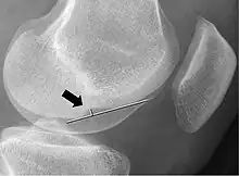 In radiology, the deep lateral femoral notch sign is a finding on a lateral radiograph that is considered an indirect sign of a torn anterior cruciate ligament (ACL).[1][2] It is an abnormal deepening of the lateral condylopatellar sulcus from an osteochondral impaction fracture.[1][3] A depth greater than 1.5 mm is a reliable sign of a torn ACL.[1]