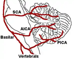 The three major arteries of the cerebellum: the SCA, AICA, and PICA. (Posterior inferior cerebellar artery is PICA.)