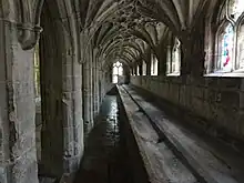 All monastic orders required handwashing before meals. A lavatorium was therefore provided near the refectory,[1] either against one wall of the cloister with a long trench basin, or as a free-standing building with a circular or octagonal basin in the centre.[2] An example of the first type, dating to the 14th century, survives at Gloucester Cathedral, and has a towel cupboard nearby. At Durham Cathedral, the lavatorium was a square building with a circular basin which was replaced in 1432–33 with one of marble.[3] At Wenlock Priory, the octagonal lavatorium, now ruined, was decorated with late-12th-century carved panels including one of Jesus with the apostles at the Sea of Galilee.[4][5] There were sometimes taps;[6] at Wenlock Priory, the water spouted from animal heads mounted on the central pillar.[7][8]