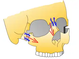 ![]() Illustration demonstrating Le Fort III osteotomy and distraction advancement |