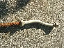 In modern times, lead was still widely used in water distribution systems and plumbing hardware before the early 20th century, including lead pipes, leaded solder and leaded alloys.[7] One part of the systems is the connections between the water mains and the water user locations. A service line is a pipe that makes the connection, which was also made of lead in those days. The first portion of the service line called gooseneck that connects to a valve at the water main requires to be flexible to allow some movements. Lead goosenecks (also called lead service connections or LSCs) were commonly used at the time due to the durability and flexibility.[8][9] In colder-weather areas, the connection between the water main and the rest of the service line is subjected to expansion and contraction during changing temperatures. When a stiffer service line made of galvanized steel pipe was used, a lead gooseneck was installed to connect to the water main to reduce breakages by such expansion and contraction.[10]