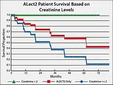 Based on studies conducted in the United States, the prognosis for individuals with ALECT2 is guarded, particularly because they are elderly and their kidney disease is usually well-advanced at the time of presentation.[17] End-stage renal disease develops in 1 out of 3 patients and has a median renal survival of 62 months.[10] A suggested prognostic tool is to track creatinine levels in ALECT2 patients. The attached Figure gives survival plotss for individuals with LECT2 renal amyloidosis and serum creatinine levels less than 2 mg/100 ml versus 2 mg/100 ml or greater than 2 mg/100 ml. The results show that afflicted individuals with lower creatinine levels have a ~four-fold higher survival rate.