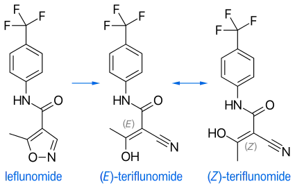 Teriflunomide is the active metabolite of leflunomide, responsible for its therapeutic actions. It results from the reaction of isoxazole ring opening, which occurs in vivo. Teriflunomide then can interconvert between the E and Z enolic forms (and the corresponding keto-amide), with the Z-enol being the most stable and therefore most predominant form.[31][32]