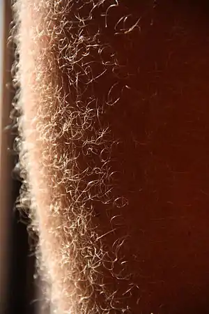 Leg hair is hair that grows on the legs of humans, generally appearing after the onset of puberty. For aesthetic reasons and for some sports, people shave, wax, epilate, or use hair removal creams to remove the hair from their legs: see leg shaving.