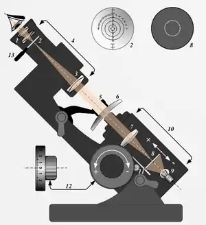 A simple lensmeter cross sectional view. 1 – Adjustable eyepiece 2 – Reticle