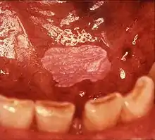 | Symptoms | Firmly attached white patch on a mucous membrane, changes with time[4][5][6] |