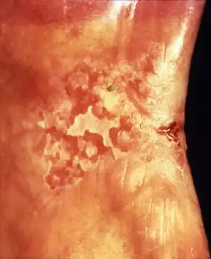 This term refers to a white lesion associated with syphilis, specifically in the tertiary stage of the infection.[15] It is not considered to be a type of idiopathic leukoplakia, since the causative agent Treponema pallidum is known. It is now rare, but when syphilis was more common, this white patch usually appeared on the top surface of the tongue and carried a high risk of cancerous changes.[19] It is unclear if this lesion was related to the condition itself or whether it was caused by the treatments for syphilis at the time.[24]