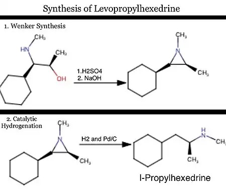 The enantiopure synthesis of levopropylhexedrine may be accomplished in a two step reaction. The first step is the Wenker synthesis of the relevant aziridine. The second step is the simple catalytic hydrogenation of the propylhexedrine-aziridine.[7]