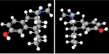 Chemically, levorphanol belongs to the morphinan class and is (−)-3-hydroxy-N-methyl-morphinan.[7] It is the "left-handed" (levorotatory) stereoisomer of racemorphan, the racemic mixture of the two stereoisomers with differing pharmacology. The "right-handed" (dextrorotatory) enantiomer of racemorphan is dextrorphan (DXO), an antitussive, potent dissociative hallucinogen (NMDA receptor antagonist), and weakly active opioid. DXO is an active metabolite of the pharmaceutical drug dextromethorphan (DXM), which, analogously to DXO, is an enantiomer of the racemic mixture racemethorphan along with levomethorphan, the latter of which has similar properties to those of levorphanol.