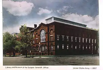When the Army's needs outgrew the capacity of the former theater, several of the units were moved in 1887 to a new building, the Army Medical Museum and Library, on the nearby National Mall (7th Street and South B Street [now Independence Avenue], SW, the present site of the Smithsonian's Hirshhorn Museum).