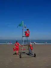 The chair or tower can also act as storage for the lifeguard, holding important rescue and communication equipment nearby. It can also act as a recognizable point for the public to find lifeguard assistance. For this reason, it is often marked with a flag or flags to enable location by the public. These flags may also give information to the bathers about current swimming conditions.
