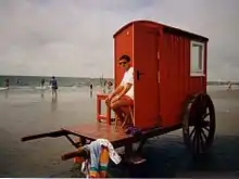 | Lifeguard on duty. When positioned at the shore: Marks the swimming area. (Sometimes also diagonal or as a red over yellow flag) | |
