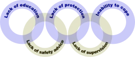 The conditions resulting in drowning are summarized by the 'drowning chain' in which each link can lead directly to an incident, or contribute to a succession of links.[2] It consists of lack of education about water safety or local conditions, a lack of safety advice (for example, about rip currents at a beach) a lack of protection (like no flotation device for a weak swimmer), lack of safety supervision, or an inability to cope with conditions (strong surf with a weak swimmer).