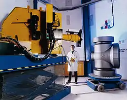 - A straight hollow pipe vacuum chamber which contains the other components. It is evacuated with a vacuum pump so that the accelerated particles will not collide with air molecules. The length will vary with the application. If the device is used for the production of X-rays for inspection or therapy the pipe may be only 0.5 to 1.5 meters long.[18] If the device is to be an injector for a synchrotron it may be about ten meters long.[19] If the device is used as the primary accelerator for nuclear particle investigations, it may be several thousand meters long.[20]