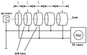 - An electronic oscillator and amplifier (G) which generates a radio frequency AC voltage of high potential (usually thousands of volts) which is applied to the cylindrical electrodes. This is the accelerating voltage which produces the electric field which accelerates the particles. As shown, opposite phase voltage is applied to successive electrodes. A high power accelerator will have a separate amplifier to power each electrode, all synchronized to the same frequency.