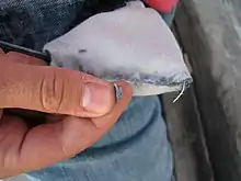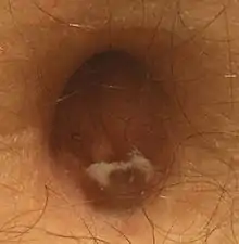 Navel lint (also known by names such as navel fluff, belly button lint, belly button fluff, and dip lint) is an accumulation of fluffy fibers in the navel cavity often found at the beginning and end of the day. Cloth fibers are scraped by body hair via friction, which ratchets the fibers in the direction of hair growth. One hypothesis is that hair travels along a lint highway defined as integral curves of the vector field given by the direction of growth of the hair, which must end at a vanishing point according to the hairy ball theorem.[8] Another is that rubbing of navel hairs and clothing contributes to a build-up of static electricity, resulting in the collection of clothing fibers and to a lesser extent, dead skin cells.
