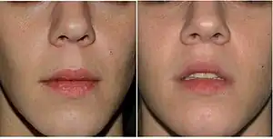 A lip lift is a plastic surgery procedure that modifies the cosmetic appearance of the lips by reshaping them to increase the prominence of the vermilion border; and to enhance the facial area above the lips into a more aesthetically pleasing shape. In corrective praxis, a lip lift procedure is distinguished from lip enhancement, the augmentation of the lips, which can be effected with a non-surgical procedure.