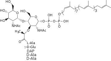 Lipid II is the final intermediate in peptidoglycan synthesis. It is formed when the MurG transferase catalyzes addition of N-acetylglucosamine (GlcNAc) to Lipid I, resulting in a complete disaccharide-pentapeptide monomer with a bactoprenol-pyrophosphate anchor. This occurs on the inside of the cytoplasmic membrane, where the bactoprenol chain is embedded in the inner leaflet of the bilayer. Lipid II is then transported across the membrane by a flippase, to expose the disaccharide-pentapeptide monomer, which is the pentapeptide stem consisting of L-Ala-γ-D-Glu-m-DAP-D-Ala-D-Ala between GlcNAc and N-acetylmuramic acid (MurNAc), for polymerization and cross-linking into peptidoglycan. The remaining bactoprenol-pyrophosphate is then recycled to the interior of the membrane. Lipid II has been referred to as the "shuttle carrier" of peptidoglycan "building blocks'.[2]