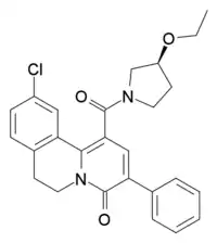 Lirequinil (Ro41-3696) is a nonbenzodiazepine hypnotic drug which binds to benzodiazepine sites on the GABAA receptor. In human clinical trials, lirequinil was found to have similar efficacy to zolpidem, with less side effects such as clumsiness and memory impairment. However it was also much slower acting than zolpidem, with peak plasma concentrations not reached until 2.5 hours after oral administration, and its O-desethyl metabolite Ro41-3290 is also active with a half-life of 8 hours.[1][2][3][4] This meant that while effective as a hypnotic, lirequinil failed to prove superior to zolpidem due to producing more next-day sedation, and it has not been adopted for clinical use. It was developed by a team at Hoffmann-La Roche in the 1990s.[5]