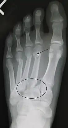 A Lisfranc injury, also known as Lisfranc fracture, is an injury of the foot in which one or more of the metatarsal bones are displaced from the tarsus.[1][2]