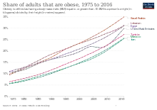 Adolescent girls are at a greater risk of becoming obese.[6] Obesity is linked to a greater availability of food, particularly from the West, and an increasingly sedentary lifestyle in urban areas. A woman who has a low level of schooling or no education in urban areas is significantly more likely to be obese. The general public is not aware of the medical conditions that result from obesity. Rather, female fatness is embraced, as it "is viewed as a sign of social status and is a cultural symbol of beauty, fertility, and prosperity".[6] Being thin is a sign of sickness or poverty.[7]