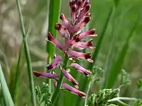| Fumaria officinalis | Fumitory | Traditionally thought to be good for the eyes and to remove skin blemishes. In modern times herbalists use it to treat skin diseases and conjunctivitis, as well as to cleanse the kidneys. However, Howard (1987) warns that fumitory is poisonous and should only be used under the direction of a medical herbalist.[77] | ![]() |