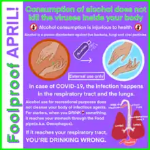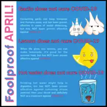Anxiety about COVID-19 makes people more willing to "try anything" that might give them a sense of control of the situation, making them easy targets for scams.[5] Many false claims about measures against COVID-19 have circulated widely on social media, but some have been circulated by text, on YouTube, and even in some mainstream media. Officials advised that before forwarding information, people should think carefully and look it up. Misinformation messages may use scare tactics or other high-pressure rhetoric, claim to have all the facts while others do not, and jump to unusual conclusions. The public was advised to check the information source's source, looking on official websites; some messages have falsely claimed to be from official bodies like UNICEF and government agencies.[5][6][7][8] Arthur Caplan, head of medical ethics at New York University's medical school, had simpler advice for COVID-19 products: "Anything online, ignore it".[5]