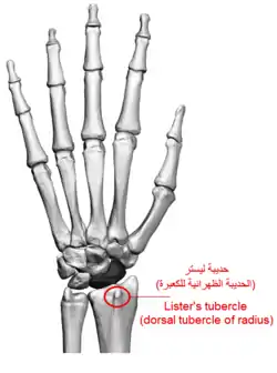 Lister's tubercle or dorsal tubercle of radius is a bony prominence located at the distal end of the radius. It is palpable on the dorsum of the wrist.