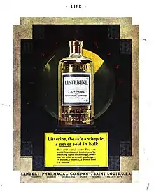 Lawrence hoped to promote Listerine's use as a general germicide as well as a surgical antiseptic, and licensed his formula to a local pharmacist named Jordan Wheat Lambert in 1881. Lambert subsequently started the Lambert Pharmacal Company, marketing Listerine.[4] Listerine was promoted to dentists for oral care in 1895[5] and was the first over-the-counter mouthwash sold in the United States, in 1914.[6]