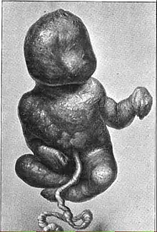 Aged 48, Mullern became pregnant, broke her water and went through labor pains for seven weeks without giving birth, retaining a swollen belly afterwards. She would suffer pain when exercising for the rest of her life, but she was able to become pregnant again and gave birth to healthy dizygotic twins. Convinced that she had been pregnant and carried the previous baby with her still, Mullern made the local physician and surgeon swear that they would open her body after her death. The physician did not survive her, but the elderly surgeon fulfilled his promise with the help of his son, finding "a hard mass of the form and size of a large Ninepin-Bowl" that contained a petrified fetus inside. It was examined by George I of Britain's personal physician Johann Georg Steigerthal, who wrote an account of it.[11] |
