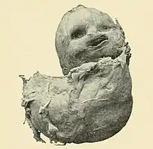 Chatri became pregnant for the first time at 40, but never gave birth after breaking her water and going through labor pains. She was bedridden for the next three years, during which she noticed a hard tumor on her lower abdomen, and complained of tiredness and abdominal pains for the rest of her life. After her death, her widower requested two physicians to examine her body, who discovered a fully formed, petrified baby girl, with remains of hair and a single tooth.[2] By 1653 the lithopedion had come into the possession of King Frederick III of Denmark, who consented to show it to Thomas Bartholin, but not to examine it further.[7] |