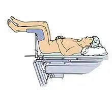 Some studies have found a significant relationship between prolonged surgical procedures with the patient in the lithotomy position and a circulatory complication known as compartment syndrome,[1][2] Nerve injury by pressure is also possible, the femoral or peroneal nerve are at risk.[3]
