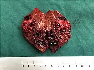 | Specimen of a surgically removed and dissected liver angiosarcoma with visible necrosis and bleeding | |