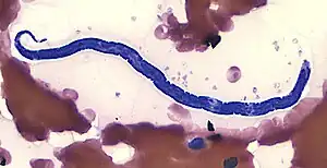 Loa loa microfilaria in thin blood smear (Giemsa stain)