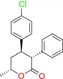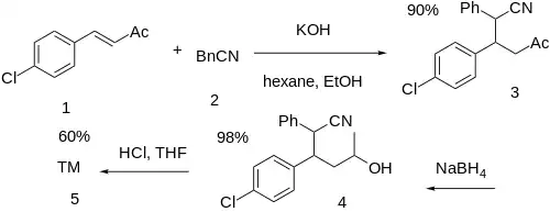 The conjugate 1,4-alkylation reaction between 4-chlorobenzylideneacetone [3160-40-5] (1) and phenylacetonitrile [140-29-4] (2) gives 3-(4-chlorophenyl)-5-oxo-2-phenylhexanenitrile, CID:333058 (3). The selective reduction of the keto group to the alcohol with sodium borohydride gives 3-(4-chlorophenyl)-5-hydroxy-2-phenylhexanenitrile, CID:12754889 (4). Hydrolysis of the nitrile to an acid would give 3-(4-Chlorophenyl)-5-hydroxy-2-phenylhexanoic acid, CID:3058345. This is followed by the concomitant lactone formation completing the synthesis of Lomevactone (5).