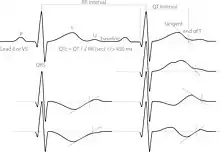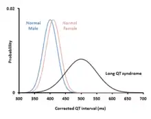 Long QT syndrome is principally diagnosed by measuring the QT interval corrected for heart rate (QTc) on a 12-lead electrocardiogram (ECG). Long QT syndrome is associated with a prolonged QTc, although in some genetically proven cases of LQTS this prolongation can be hidden, known as concealed LQTS.[22] The QTc is less than 450 ms in 95% of normal males, and less than 460 ms in 95% of normal females. LQTS is suggested if the QTc is longer than these cutoffs. However, as 5% of normal people also fall into this category, some suggest cutoffs of 470 and 480 ms for males and females respectively, corresponding with the 99th centiles of normal values.[22]