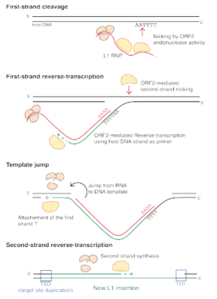 LINE elements propagate by a so-called target primed reverse transcription mechanism (TPRT), which was first described for the R2 element from the silkworm Bombyx mori.