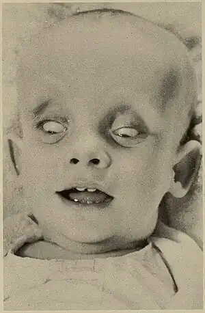 Boys with Lowe syndrome are born with cataracts in both eyes; glaucoma is present in about half of the individuals with Lowe syndrome, though usually not at birth. While not present at birth, kidney problems develop in many affected boys at about one year of age.[1] Renal pathology is characterized by an abnormal loss of certain substances into the urine, including bicarbonate, sodium, potassium, amino acids, organic acids, albumin, calcium and L-carnitine. This problem is known as Fanconi-type renal tubular dysfunction.