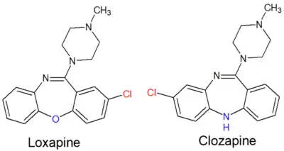 Loxapine, sold under the brand names Loxitane and Adasuve (inhalation only) among others, is a tricyclic[2] antipsychotic medication used primarily in the treatment of schizophrenia. The medicine is a member of the dibenzoxazepine class and structurally very similar to clozapine. Several researchers have argued that loxapine, initially classified as a typical antipsychotic, behaves as an atypical antipsychotic.[3]