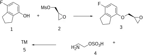 Thus reaction of 7-fluoro-4-indanol [161178-24-1] (1) with (S)-glycidyl methanesulfonate, CID:12461090 (2) in the presence of base leads to the epoxypropyl ether, CID:139677486 (3). Treatment with aminoethyl sulfate [926-39-6] (4) closes the morpholine ring giving Lubazodone (5).