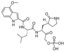 Lufotrelvir (PF-07304814) is an antiviral drug developed by Pfizer which acts as a 3CL protease inhibitor.[1] It is a prodrug with the phosphate group being cleaved in vivo to yield the active agent PF-00835231.[2] Lufotrelvir is in human clinical trials for the treatment of COVID-19, and shows good activity against COVID-19 including several variant strains, but unlike the related drug nirmatrelvir it is not orally active and must be administered by intravenous infusion, and so has been the less favoured candidate for clinical development overall.[3][4][5]
