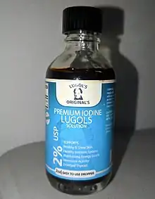 Lugol's iodine, also known as aqueous iodine and strong iodine solution, is a solution of potassium iodide with iodine in water.[2] It is a medication and disinfectant used for a number of purposes.[3][4] Taken by mouth it is used to treat thyrotoxicosis until surgery can be carried out, protect the thyroid gland from radioactive iodine, and to treat iodine deficiency.[4][5] When applied to the cervix it is used to help in screening for cervical cancer.[6] As a disinfectant it may be applied to small wounds such as a needle stick injury.[3] A small amount may also be used for emergency disinfection of drinking water.[7]