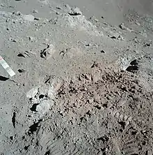 Lunar soil is composed of various types of particles including rock fragments, mono-mineralic fragments, and various kinds of glasses including agglutinate particles, volcanic and impact spherules.[3] The agglutinates form at the lunar surface by micrometeorite impacts that cause small-scale melting which fuses adjacent materials together with tiny specks of elemental iron embedded in each dust particle's glassy shell.[4] Over time, material is mixed both vertically and horizontally (a process known as "gardening") by impact processes. The contribution of material from external sources is relatively minor, such that the dirt composition at any given location largely reflects the local bedrock composition.