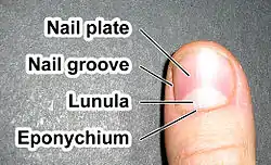 ![]() The lunula is the white crescent-shaped area at the base of a nail. | |