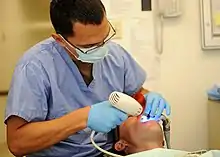 This photo shows an operator using a dental curing light to initiate the setting reaction of the dental cement used.