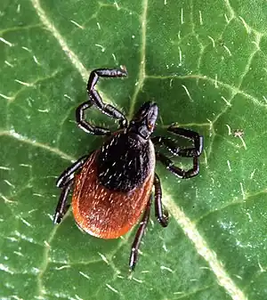 In Europe, the main vector is Ixodes ricinus, which is also called the sheep tick or castor bean tick.[72] In China, Ixodes persulcatus (the taiga tick) is probably the most important vector.[73] In North America, the black-legged tick or deer tick (Ixodes scapularis) is the main vector on the East Coast.[66]