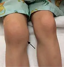 Lyme arthritis caused this 3-year-old girl's knee to become swollen. Though painless, it did make her limp.[47]