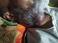 Lymphadenopathy or adenopathy is a disease of the lymph nodes, in which they are abnormal in size or consistency. Lymphadenopathy of an inflammatory type (the most common type) is lymphadenitis,[1] producing swollen or enlarged lymph nodes. In clinical practice, the distinction between lymphadenopathy and lymphadenitis is rarely made and the words are usually treated as synonymous. Inflammation of the lymphatic vessels is known as lymphangitis.[2] Infectious lymphadenitis affecting lymph nodes in the neck is often called scrofula.